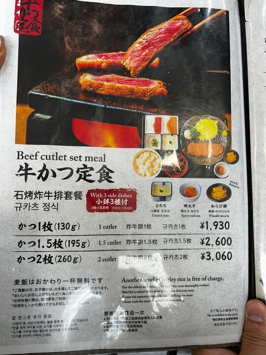 규카츠 정식은 규카츠 양에 따라 130g, 195g, 260g 3종류로 나뉘어 있어요. 저는 가장 기본은 130g을 주문해 봤습니다.